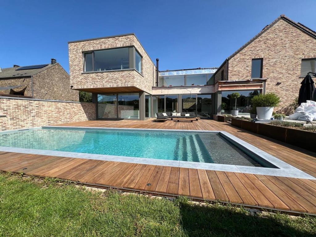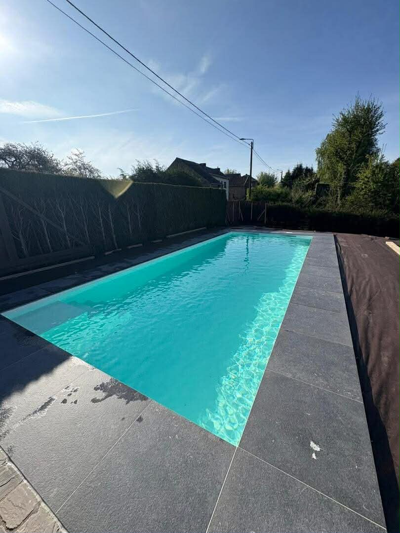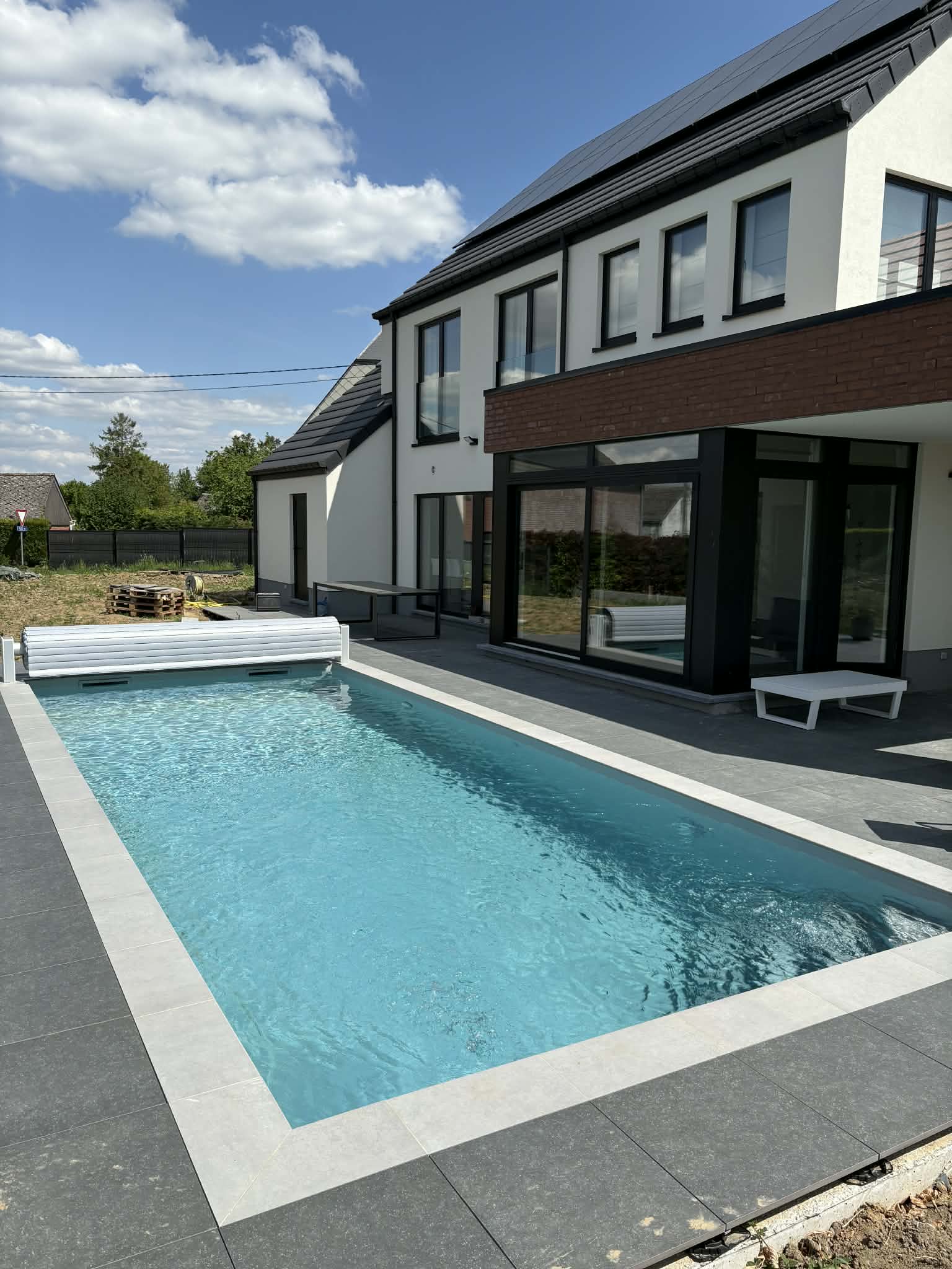 La piscine est équipée d’une membrane armée blanche et d’une couverture de sécurité Coverseal.
